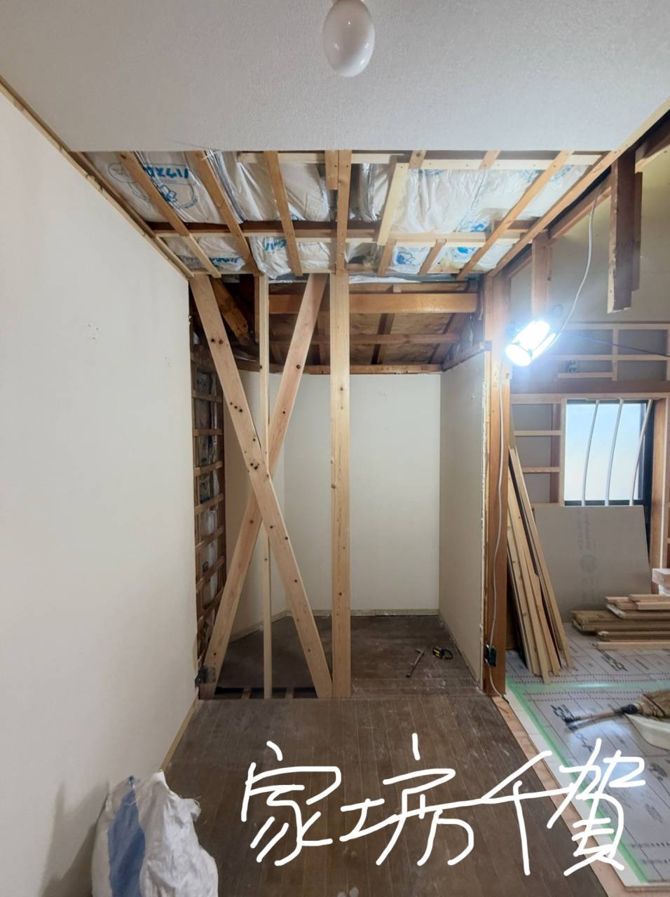 雨漏りの漏水で傷んだ木材を撤去解体し、新たに耐力壁を創り変え、ハンガーパイプや可動棚レール下地、固定棚に活用させて頂きました。